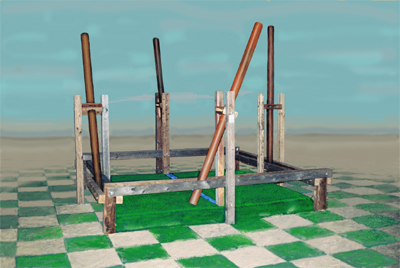 Installation aus Holz, Sand, Kunstrasen, Plastikröhren, Erbsen,